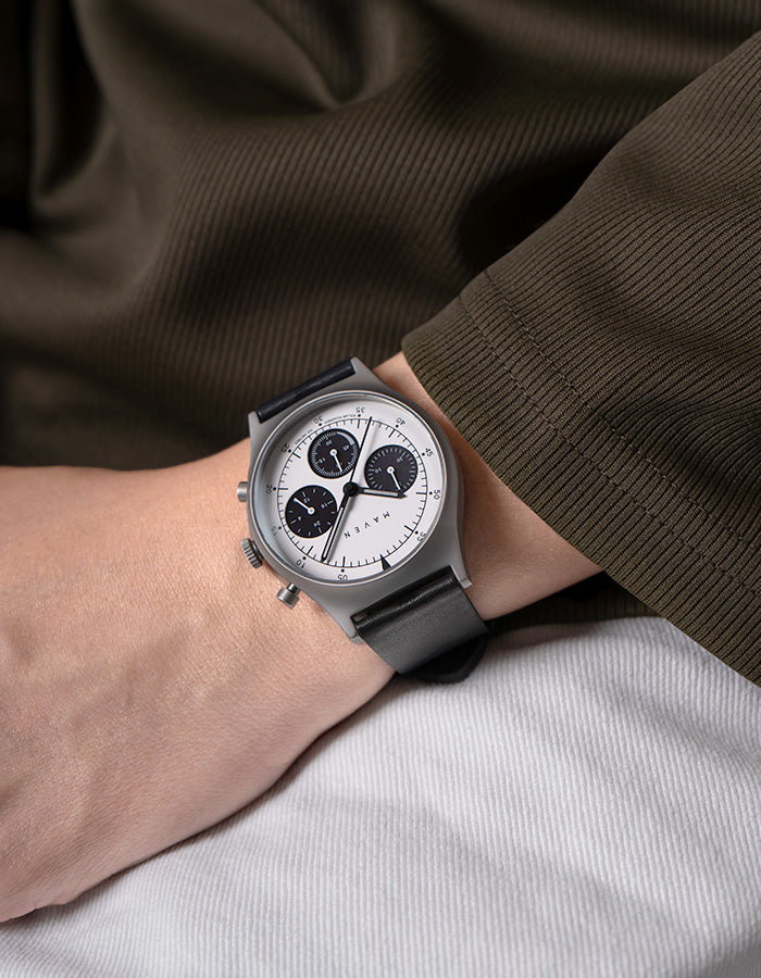 The MUS Solar Chrono embodies MAVEN's minimalist silhouette, blending timeless style with uncompromising quality. Inspired by a deep study of watch movements, we landed on a solar chronograph movement developed by Seiko Epson, which works by converting light energy into electronic energy. This approach showcases our commitment to advancing watchmaking technology while maintaining a classic aesthetic.